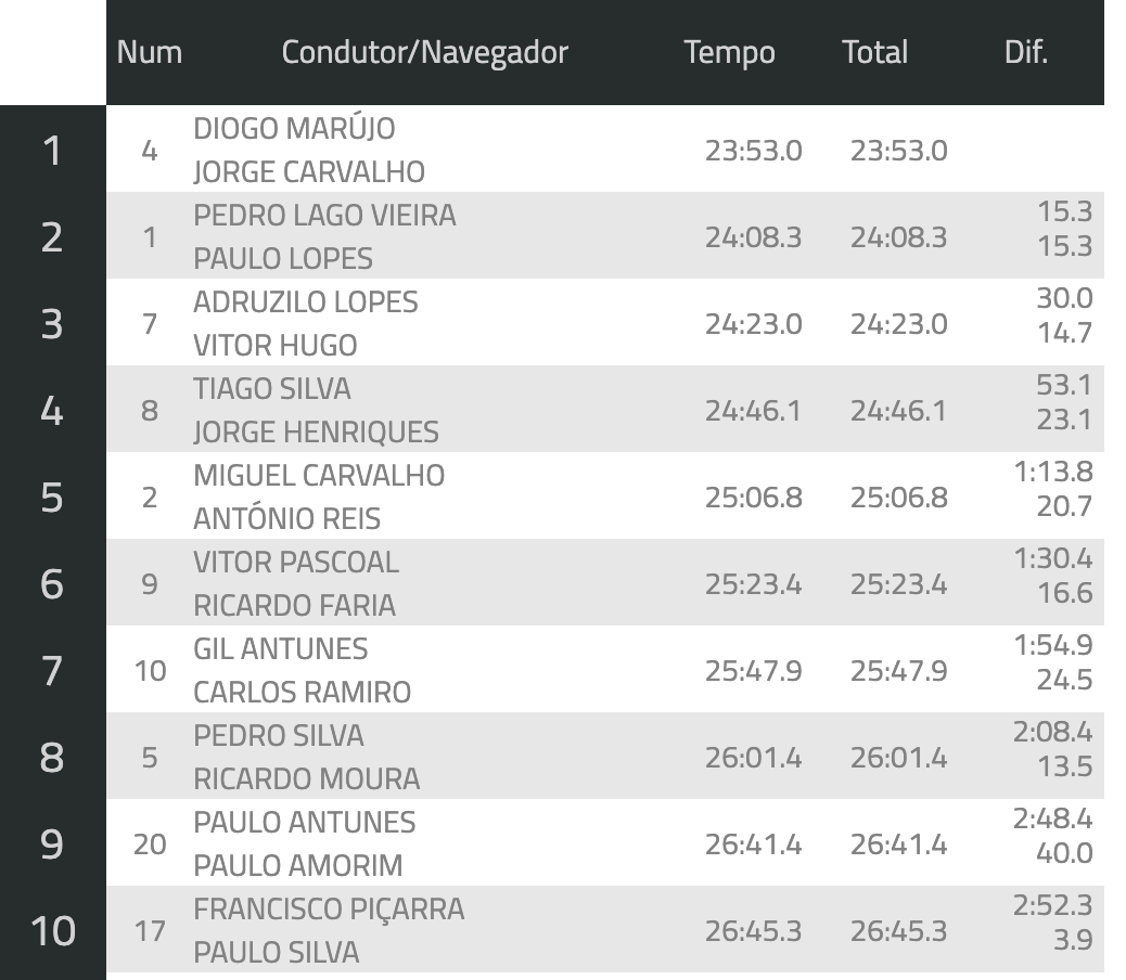 Desta forma, Diogo Marujo obteve uma grande vitória, superando Pedro Lago Vieira (em estreia ao voalnte do Skoda), que perdeu confiança logo no primeiro troço, mas que mesmo assim conseguiu andar próximo do vencedor, obtendo um bom segundo lugar da geral, terminando a pouco mais de 15s do primeiro lugar. Quando se esperava um ataque de Adruzilo da parte da tarde, passou-se exatamente o contrário, acabando o veterano piloto por ficar no terceiro lugar, mas já a 30s do primeiro lugar.